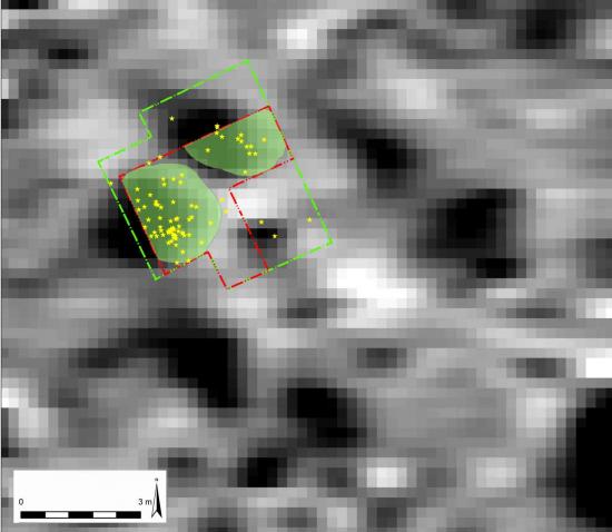 Geophysical survey results (grey-scale), trench edge (green line), sondage (red line), excavated pits (green area) and worked flints (yellow stars)